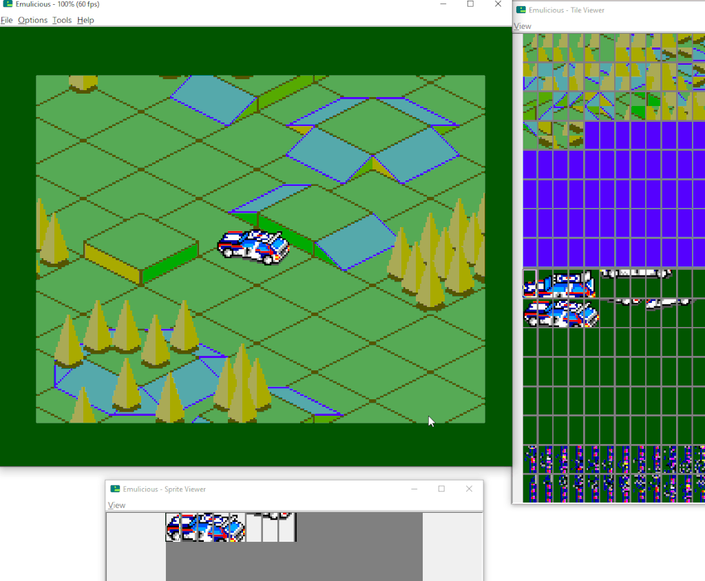 Since the last update, I’ve tried coming up with solutions on how to fix the glitchy sprite tiles when changing direction. The problem stems from me trying to copy too many tiles to VDP memory during vblank. The VDP tries to render the graphics while I’m still trying to copy memory and that causes conflicts. The friendly smspower folks suggested a “double buffered” solution where I’d copy the car’s tiles over two game frames. Copy half-ish of the car’s tiles on the first frame, then the rest on the second frame. When copying, put the tiles into a “back buffer”, i.e. an unused area of VDP memory while the active sprites use a different area. When the copy is done, make the sprite use the newly copied area and then next frame copy the tiles into the “old” area.