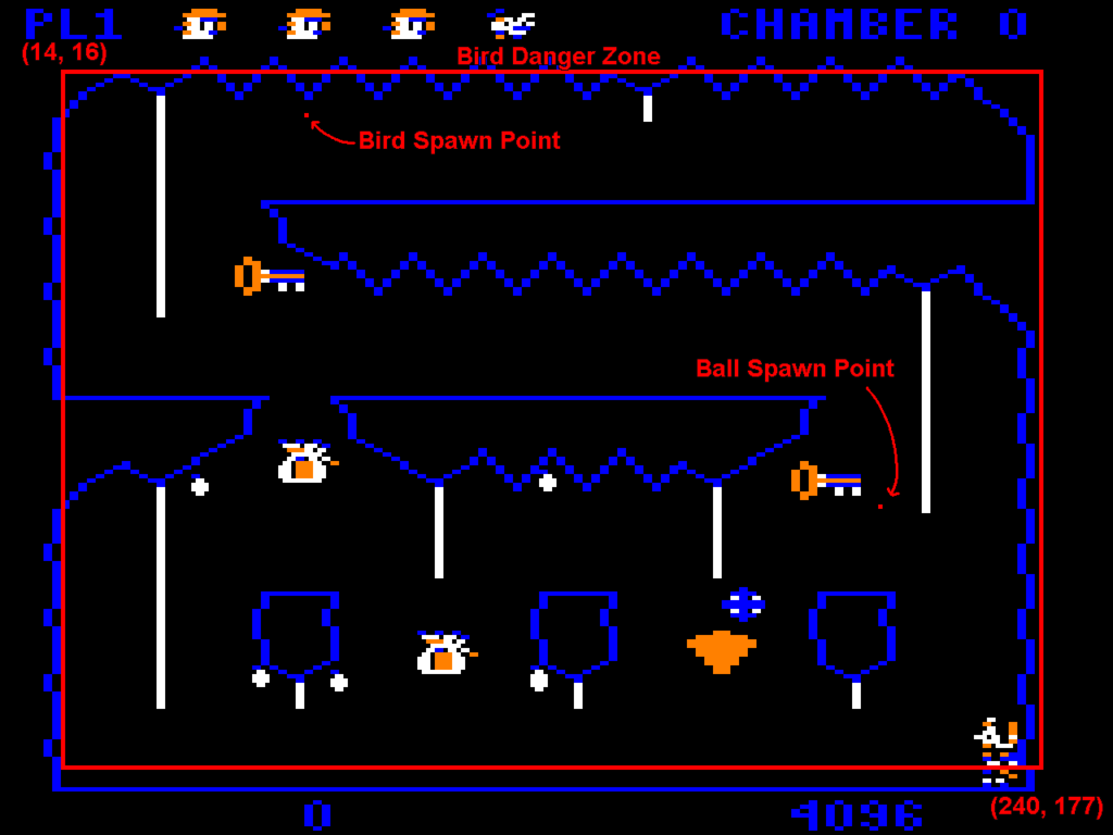 Unlike the ball, the bird doesn’t try to detect the chamber’s terrain. It just flies straight in a direction until it hits an invisible wall and then reflects off. The walls are defined by a bounding box with screen coordinates (14, 16) for the top left and (240, 177) for the bottom right.