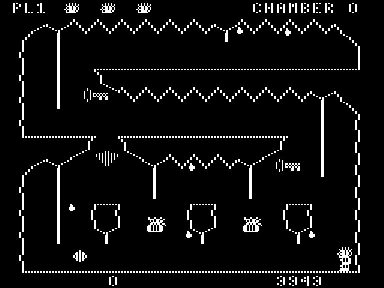 But the game actually has color. How does that work? Notice the spacing between the pixels on the floor and the diamond. The game draws its graphics in such a way to take advantage of CRT artifacting effects. These effects helps the game simulate a limited set of colors. This was a common technique used at the time, as seen on other computers like the Apple II.